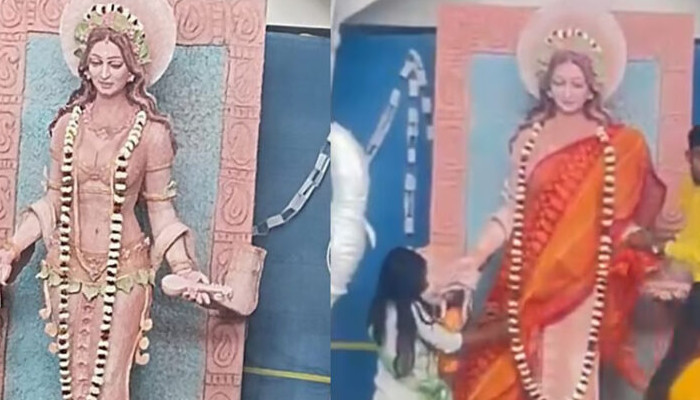 സാരി ധരിക്കാതെയുള്ള സരസ്വതി വിഗ്രഹത്തിന്റെ ചിത്രങ്ങള് സമൂഹമാധ്യമത്തിൽ വൈറലാതോടെയാണ് പ്രതിഷേധം. പ്രതിഷേധം കനത്തതിനെ തുടർന്ന് വിഗ്രഹത്തിന് സാരി പുതപ്പിക്കുകയും ചെയ്തു. പരമ്പരാഗതമായ സാരി ഉടുപ്പിക്കാതെ ദേവിയെ വികലമായി ചിത്രീകരിക്കരുത്. ഇത്തരം നീക്കങ്ങള്ക്കെതിരെ ശക്തമായി പോരാടും. എബിവിപി ജോയിന്റ് സെക്രട്ടറി ദിബാകർ ആചാരി പറഞ്ഞു.