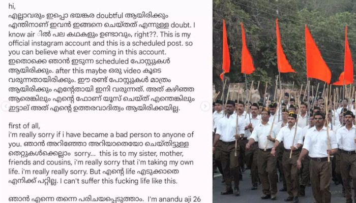 ആർഎസ്എസ് ശാഖയിൽ, പ്രവർത്തകരിൽ നിന്നും നിരന്തരമായി ലൈംഗിക പീഡനങ്ങൾക്ക് ഇരയായി എന്ന് എഴുതിവെച്ച് യുവാവ് ജീവനൊടുക്കി. കോട്ടയം തമ്പലക്കാട് സ്വദേശിയായ അനന്തുവാണ് ആത്മഹത്യ ചെയ്തത്. ആർഎസ്എസ് എന്ന സംഘടനയിൽ നിന്നും പ്രവർത്തകരിൽ നിന്നും തനിക്ക് നേരിടേണ്ടി വന്ന ക്രൂരതകളും പീഡനങ്ങളും വിശദമാക്കുന്ന കുറിപ്പ്, മരണശേഷം പുറത്തുവരുന്ന രീതിയിൽ അനന്തു ഇൻസ്റ്റാഗ്രാമിൽ ഷെഡ്യൂൾ ചെയ്ത് പോസ്റ്റ് ചെയ്യുകയായിരുന്നു.