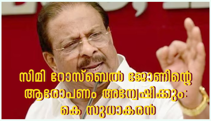 എഐസിസി അംഗവും മഹിളാ കോണ്ഗ്രസ് മുൻ ദേശീയ ജനറല് സെക്രട്ടറിയുമായിരുന്ന സിമി റോസ്ബെല് ജോണിന്റെ ആരോപണം പരിശോധിക്കുമെന്ന് കെപിസിസി പ്രസിഡന്റ് കെ സുധാകരൻ. പരാതി അന്വേഷിക്കാൻ കെപിസിസി ഭാരവാഹികള് ഉള്പ്പെട്ട മൂന്നംഗ സമിതിയെ വയ്ക്കുമെന്നും അദ്ദേഹം മാധ്യമപ്രവര്ത്തകരോട് പറഞ്ഞു. കഴിഞ്ഞ ദിവസം കോണ്ഗ്രസില് കാസ്റ്റിങ് കൗച്ചുണ്ടെന്ന് സിമി റോസ്ബെല് വെളിപ്പെടുത്തിയിരുന്നു. പ്രതിപക്ഷ നേതാവ് വി ഡി സതീശനെതിരെയും സിമി റോസ് ബെല് ആരോപണമുന്നയിച്ചിരുന്നു.