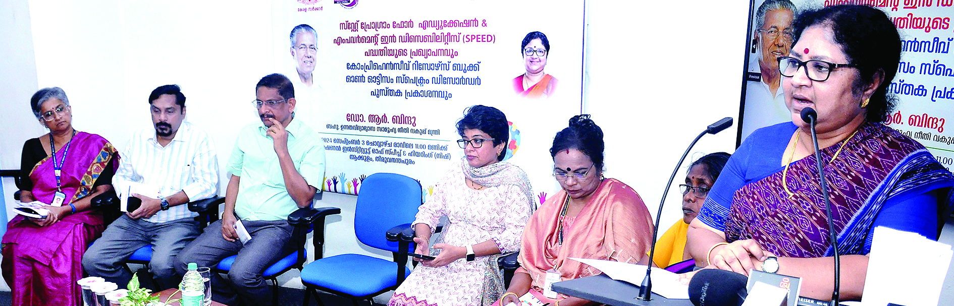 ഭിന്നശേഷി മേഖലയിലെ ഇടപെടലുകള്ക്ക് വേഗത നല്കാന് ‘സ്പീഡ്’ പദ്ധതിയുമായി സംസ്ഥാന സര്ക്കാര്. സ്റ്റേറ്റ് പ്രോഗ്രാം ഫോർ എജ്യൂക്കേഷൻ ആന്റ് എംപവർമെന്റ് ഇൻ ഡിസെബിലിറ്റീസ് പദ്ധതിയുടെ പ്രഖ്യാപനവും കോംപ്രിഹെൻസീവ് റിസോഴ്സ് ബുക്ക് ഓൺ ഓട്ടിസം സ്പെക്ട്രം ഡിസോർഡർ പുസ്തക പ്രകാശനവും ഉന്നതവിദ്യാഭ്യാസ സാമൂഹ്യനീതി മന്ത്രി ഡോ. ആർ ബിന്ദു നിർവഹിച്ചു. സർക്കാരിന്റെ നാലാമത് നൂറുദിന പരിപാടികളോടനുബന്ധിച്ചാണ് ഭിന്നശേഷി മേഖലയിലെ പരിശീലന ബോധവല്ക്കരണ പരിപാടികൾ ഉൾക്കൊള്ളിച്ചു കൊണ്ട് ‘സ്പീഡ്’ എന്ന പദ്ധതി പ്രഖ്യാപിച്ചത്. വിവിധ തരം ഭിന്നശേഷി അവസ്ഥകളെപ്പറ്റി വിശദമായി പഠിക്കുന്നതിനും ആവശ്യമായ മുൻകൂർ ഇടപെടൽ സാധ്യമാക്കുന്നതിനും പ്രവർത്തന മാർഗരേഖകൾ തയ്യാറാക്കാനും, ആവശ്യമായ പരിശീലന പരിപാടികൾ സംഘടിപ്പിക്കാനും വേണ്ടിയുള്ള ഇടപെടൽ സാമൂഹ്യ സുരക്ഷാ മിഷൻ സ്റ്റേറ്റ് ഇനീഷ്യേറ്റീവ് ഓൺ ഡിസെബിലിറ്റീസ് മുഖാന്തരം നടപ്പിലാക്കി വരുന്നു. ഈ പ്രവർത്തനങ്ങൾക്ക് ഒരു ഏകോപനവും തുടർച്ചയും ആവശ്യമാണെന്നതിനാലാണ് ഭിന്നശേഷി മേഖലയുമായി ബന്ധപ്പെട്ട പ്രതിരോധ പ്രവർത്തനം മുതൽ പുനരധിവാസം വരെ നീണ്ടു നിൽക്കുന്ന ഈ മേഖലയിൽ പ്രവർത്തിക്കുന്ന എല്ലാ മെഡിക്കൽ/റിഹാബിലിറ്റേഷൻ / പാരാ മെഡിക്കൽ / സപ്പോർട്ട് സർവീസ് / വിവിധ പേരന്റ്ഗ്രൂപ്പുകൾ എന്നിവർക്കായി തുടർച്ചയായ പരിശീലന, ബോധവല്ക്കരണ പരിപാടികൾ സാമൂഹ്യനീതി വകുപ്പ് – സാമൂഹ്യ സുരക്ഷാ മിഷൻ — നടപ്പിലാക്കുന്നത്. ഇതിന്റെ ഭാഗമായാണ് ‘സ്റ്റേറ്റ് പ്രോഗ്രാം ഫോർ എജ്യൂക്കേഷൻ ആന്റ് എംപവർമെന്റ് ഇൻ ഡിസെബിലിറ്റീസ്’ പദ്ധതി പ്രഖ്യാപിച്ചിട്ടുള്ളത്. പദ്ധതിയുടെ ഭാഗമായാണ് ഓട്ടിസം മേഖലയിലെ മുൻകൂട്ടിയുള്ള കണ്ടെത്തലിനും ഇടപെടലിനും അവശ്യമായ “കോംപ്രിഹെൻസീവ് റിസോഴ്സ് ബുക്ക് ഓൺ ഓട്ടിസം സ്പെക്ട്രം ഡിസോർഡർ” എന്ന ബുക്ക് തയ്യാറാക്കിയിരിക്കുന്നത്. ഓട്ടിസവുമായി ബന്ധപ്പെട്ട് കുറെയേറെ കാര്യങ്ങൾ ചെയ്യാൻ സർക്കാരിന് സാധിച്ചിട്ടുണ്ടെന്ന് മന്ത്രി ആർ ബിന്ദു പറഞ്ഞു. പലയിടങ്ങളിലായി ഓട്ടിസം കേന്ദ്രങ്ങൾ ആരംഭിക്കുവാനും നിപ്മർ കേന്ദ്രീകരിച്ച് ഓട്ടിസം സംബന്ധിച്ച് ശാസ്ത്രീയ ഗവേഷണങ്ങൾ മുന്നോട്ടുകൊണ്ടുപോകുന്ന കരുത്തുറ്റ കേന്ദ്രം സ്ഥാപിക്കുവാനും സാധിച്ചിട്ടുണ്ടെന്ന് മന്ത്രി പറഞ്ഞു. ഓട്ടിസമുള്ള കുട്ടികളെ സമ്പൂർണമായും സാമൂഹ്യവല്ക്കരിക്കുന്നതിന് വിശാലമായ മാനവികതയോടു കൂടിയുള്ള സമീപനം സമൂഹത്തിൽ നിന്നുണ്ടാകണം. ഓട്ടിസം സ്പെക്ട്രം ഡിസോഡേഴ്സിന്റെ പ്രത്യേകതകളെക്കുറിച്ച് സമഗ്രതയോടെ ഉള്ള പഠനങ്ങൾ അനിവാര്യമാണെന്നും ഇത്തരം പഠനങ്ങൾ ഒരുപാട് കുടുംബങ്ങൾക്ക് ആശ്വാസകരമാവുമെന്നും മന്ത്രി അഭിപ്രായപ്പെട്ടു.