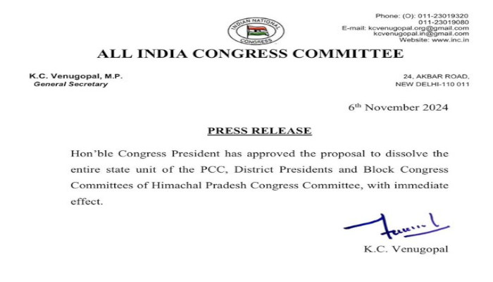 ഹിമാചല് പ്രദേശില് സംസ്ഥാന കമ്മിറ്റി ഉള്പ്പെടെ കോണ്ഗ്രസ്സിന്റെ എല്ലാ കമ്മിറ്റികളും പിരിച്ചുവിട്ടു. ജില്ലാ പ്രസിഡന്റുമാരെയും ബ്ലോക്ക് കമ്മിറ്റിയും പിരിച്ചുവിട്ടു. കൊണ്ഗ്രസ്സ് അദ്ധ്യക്ഷന് മല്ലികാര്ജുന ഖാര്ഗെയുടെ അനുമതിയോടെയാണിത്. കമ്മിറ്റി പിരിച്ചുവിടുന്നതിനെക്കുറിച്ചുള്ള വിശദീകരണ കത്തും പുറത്ത് വന്നിട്ടുണ്ട്. കെസി വേണുഗോപാലിന്റെ പേരിലാണ് കത്ത്.