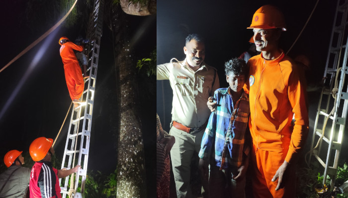 അറുപത് അടിയോളം ഉയരത്തിൽ പനയുടെ മുകളിൽ കയറി കുടുങ്ങിയ പന്ത്രണ്ട്കാരനെ മാനന്തവാടി അഗ്നിരക്ഷ സേന സുരക്ഷിതമായി താഴെയിറക്കി. കൊമ്മയാട് വേലുക്കര ഉന്നതിയിലെ ബിന്ദുവിന്റെ മകൻ വിവേകിനെയാണ് സേന രക്ഷപ്പെടുത്തിയത്.വൈകുനേരം മുതൽ കാണാതായ കുട്ടിയെ അർദ്ധരാത്രിയോടെ പനയുടെ മുകളിൽ കണ്ടത്. സമീപത്തുള്ള വലിയ മരത്തിലൂടെ കയറിയ ശേഷം പനയിലേക്ക് കയറുകയാണ് ചെയ്തത്.