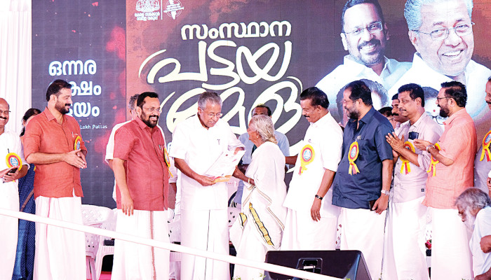 സംസ്ഥാനം ഭൂരഹിതരില്ലാത്ത കേരളം എന്ന ലക്ഷ്യത്തിലേക്ക് സംസ്ഥാനം അടുക്കുകയാണെന്ന് മുഖ്യമന്ത്രി പിണറായി വിജയൻ. സംസ്ഥാന പട്ടയമേള തേക്കിന്കാട് മൈതാനിയിലെ വിദ്യാര്ത്ഥി കോര്ണറില് ഉദ്ഘാടനം ചെയ്യുകയായിരുന്നു മുഖ്യമന്ത്രി. അർഹരായവർക്കെല്ലാം പട്ടയം നൽകുന്നത് അതീവ പ്രാധാന്യത്തോടെയാണ് സർക്കാർ കണക്കാക്കിയിട്ടുള്ളത്. ഭൂമിയില്ലാത്തവരെ കണ്ടെത്തി അവർക്കുള്ള ഭൂമി, ആവശ്യമായ അനുമതി, രേഖ എന്നിവ ലഭ്യമാക്കൽ, വ്യവഹാരങ്ങളിൽ ഉൾപ്പെട്ട ഭൂമിയാണെങ്കിൽ തീർപ്പ് ഉണ്ടാക്കൽ എന്നിവ ഒരേസമയം നിർവഹിച്ചാണ് പ്രവൃത്തികൾ ത്വരിതപ്പെടുത്തുന്നത്.