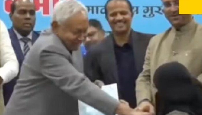 ആയുഷ് ഡോക്ടർമാർക്കുള്ള നിയമന ഉത്തരവ് കൈമാറുന്ന സർക്കാർ പരിപാടിയിൽ പങ്കെടുത്ത യുവതിയുടെ ഹിജാബ് പിടിച്ചുതാഴ്ത്തി മുഖ്യമന്ത്രി നിതീഷ് കുമാർ. സംഭവത്തിന്റെ വീഡിയോ ദൃശ്യങ്ങൾ വൈറൽ ആയതോടെ പ്രതിക്ഷേധമുയര്ന്നിരിക്കുകയാണ്.