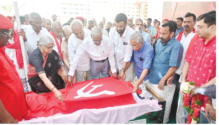 ജീവിത പങ്കാളി വിജയലക്ഷ്മി, മക്കളായ നിഖില്, കപില് എന്നിവരുള്പ്പെടെ ബന്ധുക്കളും കര്ഷകത്തൊഴിലാളികള്, യുവജന — വിദ്യാര്ത്ഥികള്, മഹിളകള് എന്നിങ്ങനെ ജീവിതത്തിന്റെ നാനാതുറകളിലുള്ള ആയിരങ്ങള് പ്രിയനേതാവിന് കണ്ണീരോടെ അന്ത്യാഞ്ജലി നേര്ന്നു.തുടർന്ന് പൂര്ണ ഔദ്യോഗിക ബഹുമതികള്ക്കുശേഷം നൂറുകണക്കിന് ചുവപ്പ് വോളണ്ടിയര്മാരുടെയും പാര്ട്ടി പ്രവര്ത്തകരുടെയും അകമ്പടിയോടെ തുറന്ന വാഹനത്തില് ഗാന്ധി ബോധന ആശുപത്രിയിലെത്തിച്ച മൃതദേഹം പഠനത്തിനായി കൈമാറി. കണ്ണുകള് എൽബി പ്രസാദ് നേത്രാശുപത്രിക്കാണ് നല്കിയത്.
