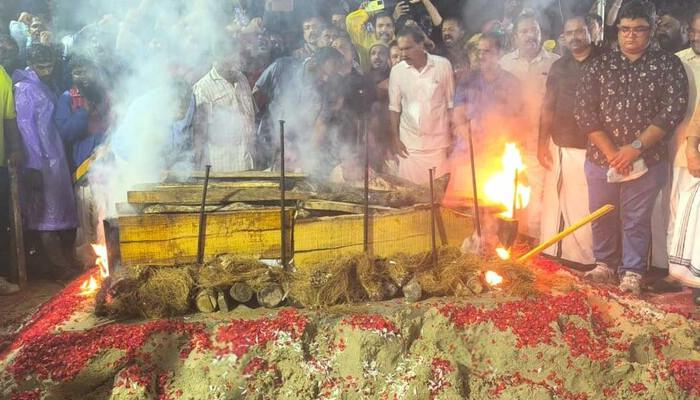 പുന്നപ്ര രക്തസാക്ഷികളും പി കൃഷ്ണപിള്ള ഉള്പ്പെടെയുള്ള കമ്യുണിസ്റ്റ് നേതാക്കളും അന്ത്യ വിശ്രമം കൊള്ളുന്ന വലിയ ചുടുകാട്ടിലെ പ്രത്യേകം തയാറാക്കിയ ചിതയിലേക്ക് രാത്രി 9.16ന് മകൻ വി എ അരുൺ കുമാർ അഗ്നിപകർന്നു.