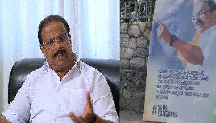 ‘പദവി ഉണ്ടെങ്കിലും ഇല്ലെങ്കിലും കെ എസ് എന്ന കുമ്പക്കുടി സുധാകരൻ തന്നെയാണ് സാധാരണ കോൺഗ്രസ് പ്രവർത്തകരുടെ തലയെടുപ്പുള്ള രാജാവ്’ എന്ന പ്രചാരണവുമായി പാലക്കാട് നഗരമധ്യത്തിൽ പോസ്റ്ററുകൾ. കോട്ടമൈതാനത്തിന് സമീപം ഐഎംഎ ജംഗ്ഷനിലാണ് സുധാകരനായുള്ള പോസ്റ്ററുകൾ പ്രത്യക്ഷപ്പെട്ടത്. സേവ് കോൺഗ്രസ് എന്ന പേരിലാണ് പോസ്റ്ററുകൾ സ്ഥാപിച്ചിട്ടുള്ളത്.