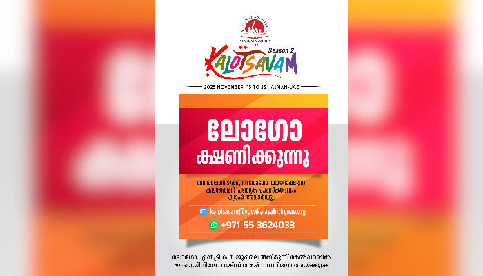 യുവകലാസാഹിതി യു എ ഇ തലത്തിൽ കുട്ടികൾക്കായി 2025 നവംബർ മാസത്തിൽ സംഘടിപ്പിക്കുന്ന കലോത്സവത്തിന് ലോഗോ ക്ഷണിക്കുന്നു. ലോകത്തെവിടെയുള്ളവർക്കും പ്രായഭേദമന്യേ ഈ മത്സരത്തിൽ പങ്കെടുക്കാവുന്നതാണ് . തെരഞ്ഞെടുക്കുന്ന ലോഗോ തയ്യാറാക്കുന്ന കലാകാരന് കാഷ് അവാർഡും പ്രത്യേക പുരസ്‍കാരവും നൽകുന്നതാണ്. ലോഗോ 2025 ജൂലൈ 30 ന് മുമ്പ് [email protected] എന്ന വിലാസത്തിലോ, ‪+971553624033‬ എന്ന What­sApp നമ്പറിലേക്കോ അയക്കേണ്ടതാണ്